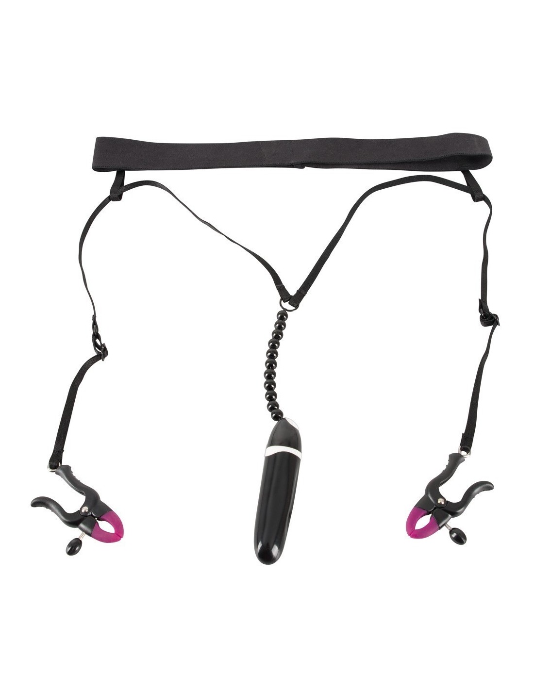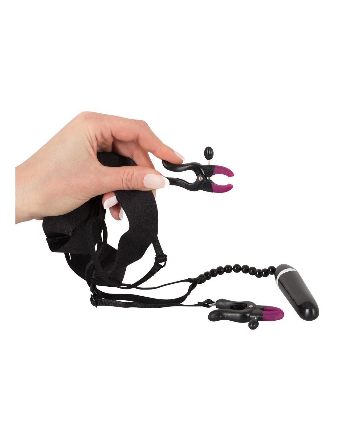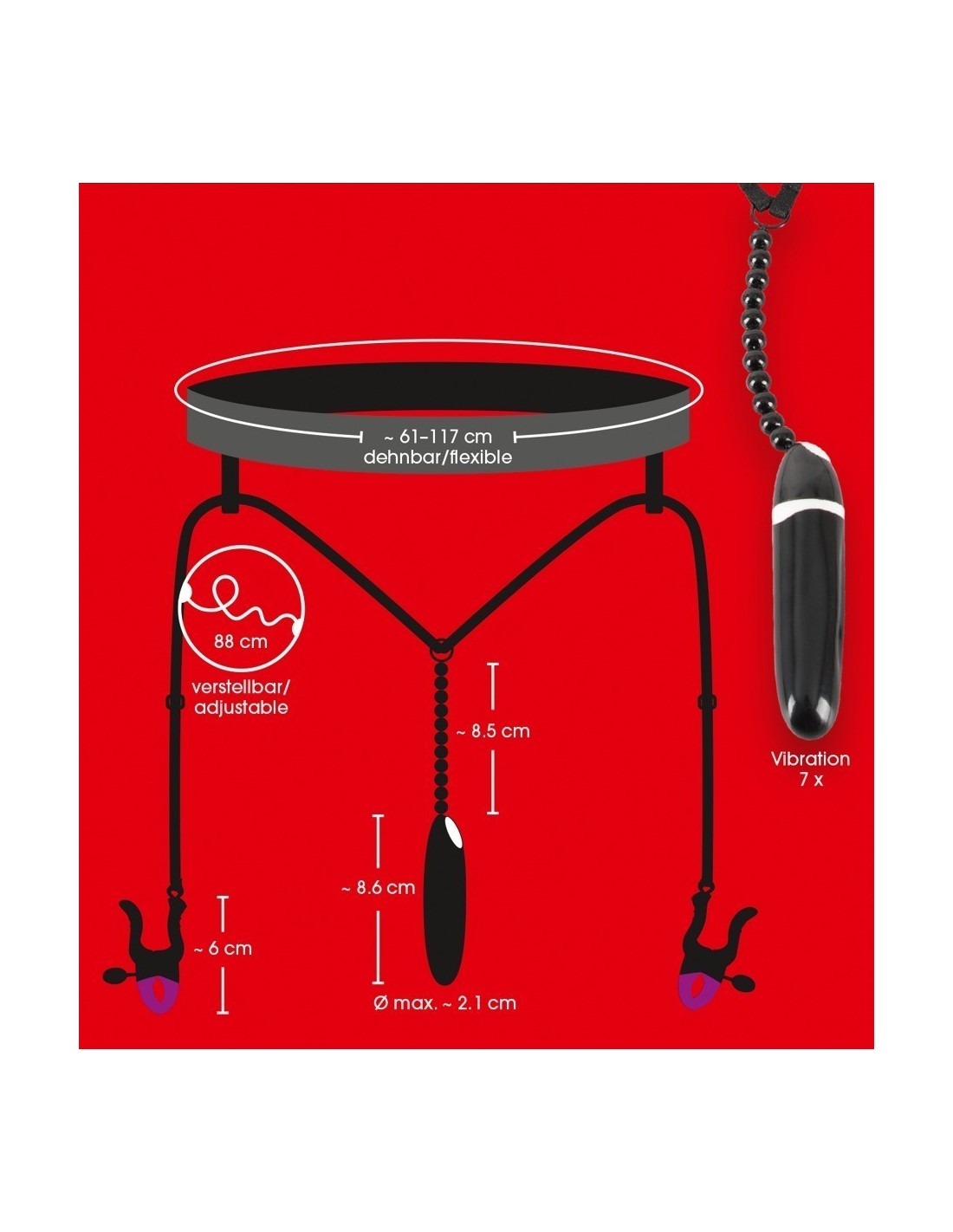 La corda ha anche una fila di perle per stimolare il clitoride e un piccolo vibratore ad esso collegato.