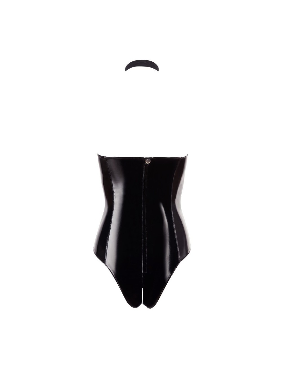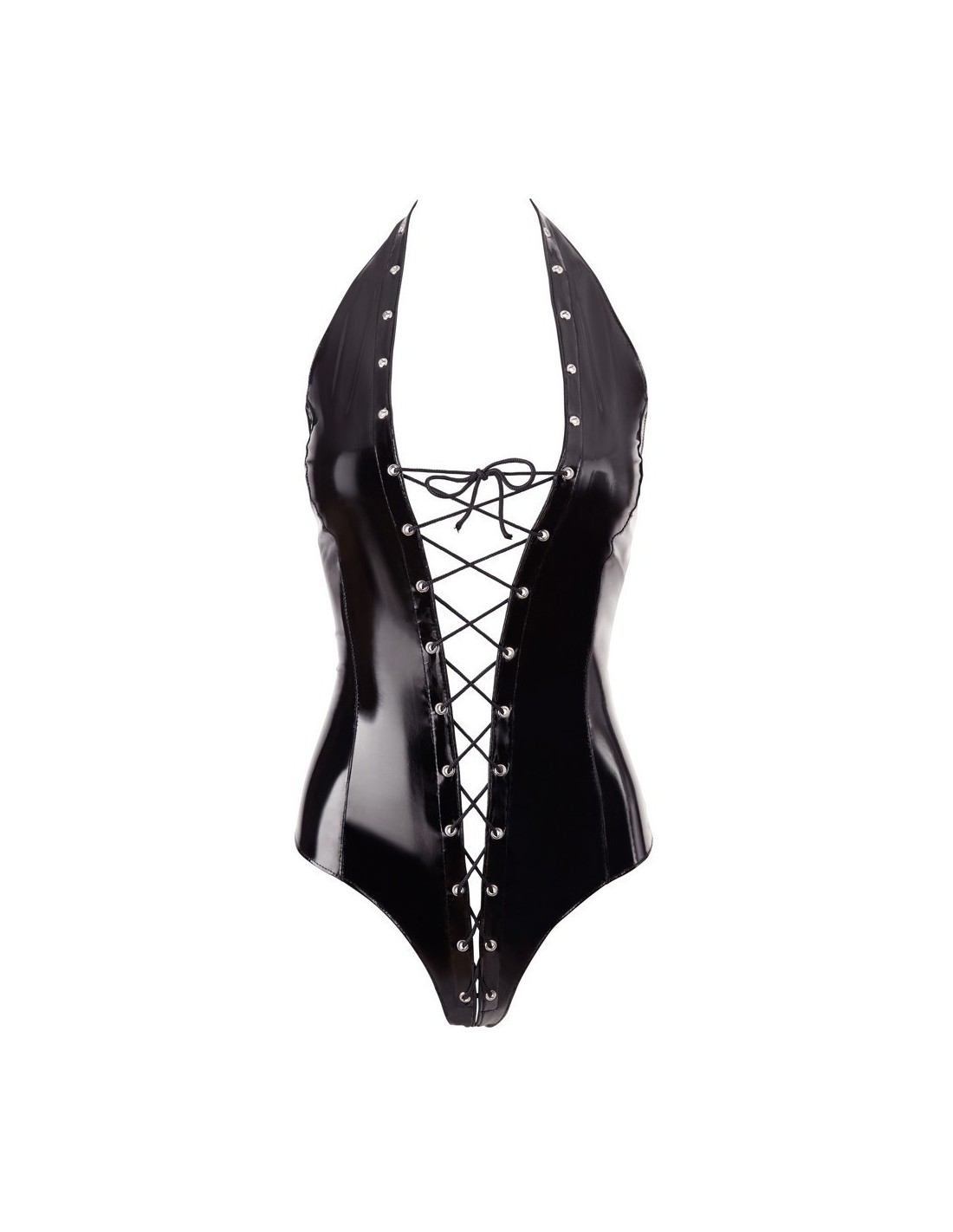 Body in vinile nero con scollo all'americana e allacciatura fantasia sul davanti che arriva fino al cavallo aperto. Con cerniera e bottone automatico sul retro. 100% poliestere con rivestimento in poliuretano.