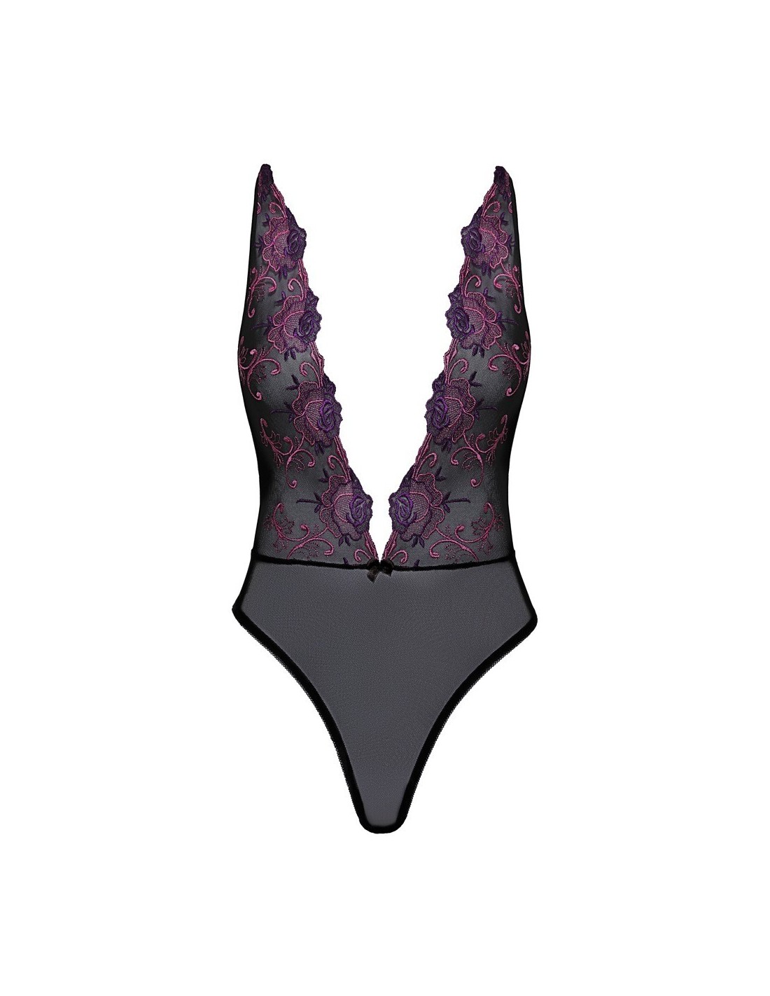 Body extra scollato di kissable realizzato in pregiato powernet nero con intricati ricami floreali
