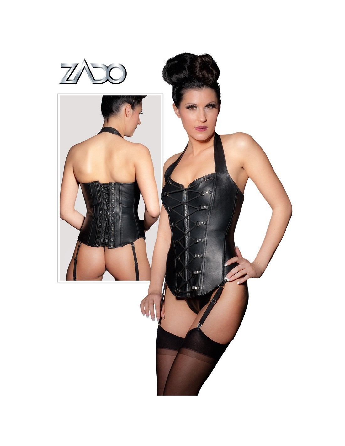 Passion Woman LingerieCorsetto in pelle che aderisce perfettamente alle vostre curve. Con cinturino halterneck e incorporata in una struttura rigida per assicurare una vestibilità straordinaria. Con quattro cinghieCorsetto in Pelle nera con Struttura Rigida bretelle regolabili e removibili. Dispone di una cerniera a tutta lunghezza e lacci anteriori e posteriori. Viene fornito con perizoma abbinato