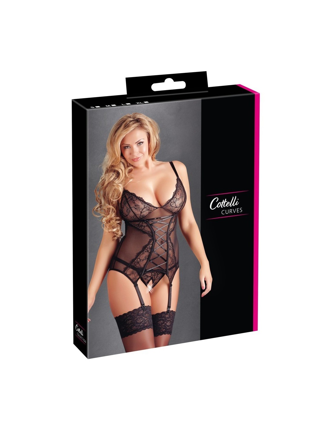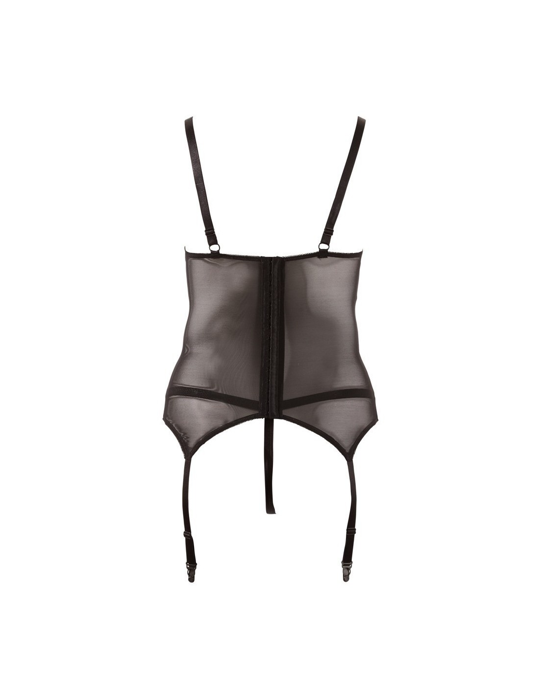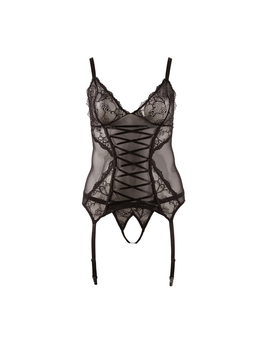 Guepierre in tulle e pizzo. Intrigante l'intreccio di laccetti sul davanti, ganci per le calze regolabili e perizoma aperto coordinato completo. 90% Polyamid, 10% Elasthan