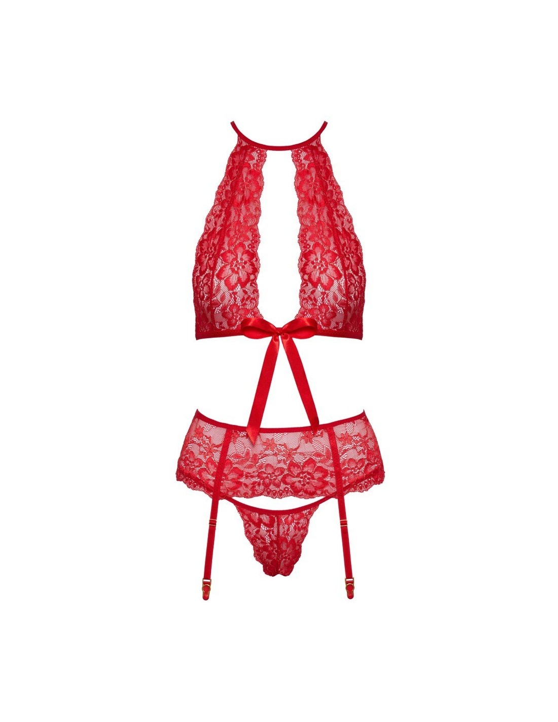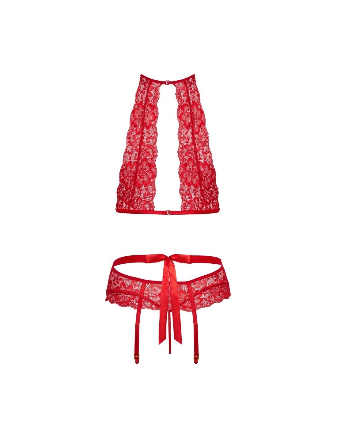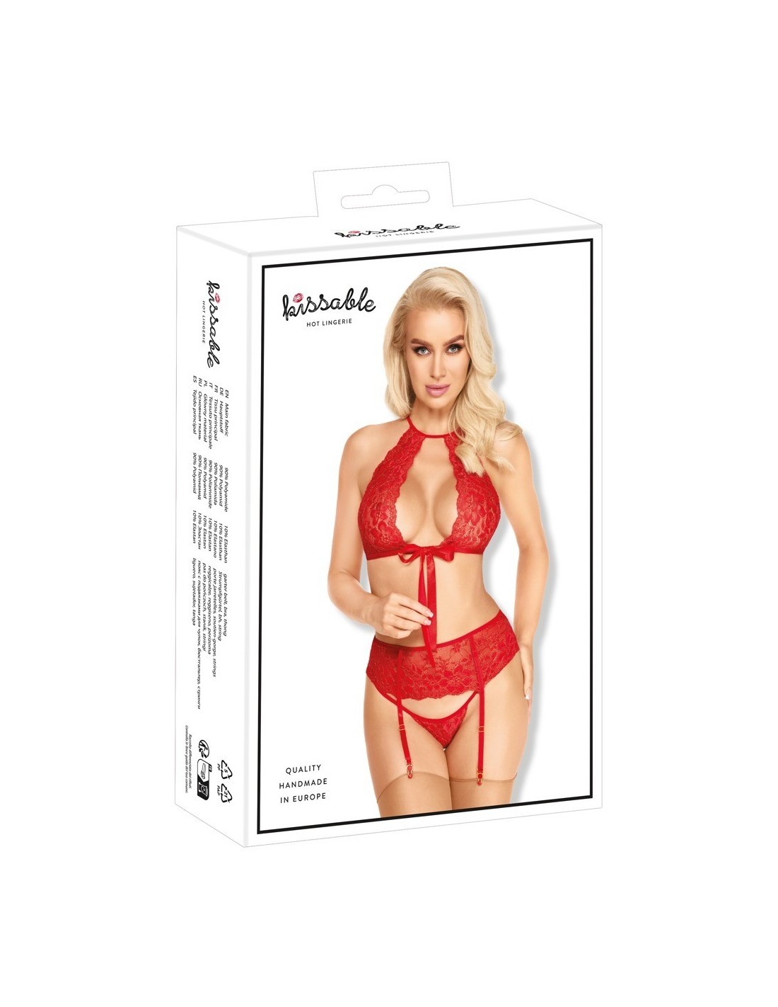Morbido reggiseno, reggicalze e perizoma di kissable completamente realizzati in pregiato pizzo rosso con dettagli e riflessi dorati. Morbido ed elastico su tutto il corpo per il massimo comfort. Reggiseno
