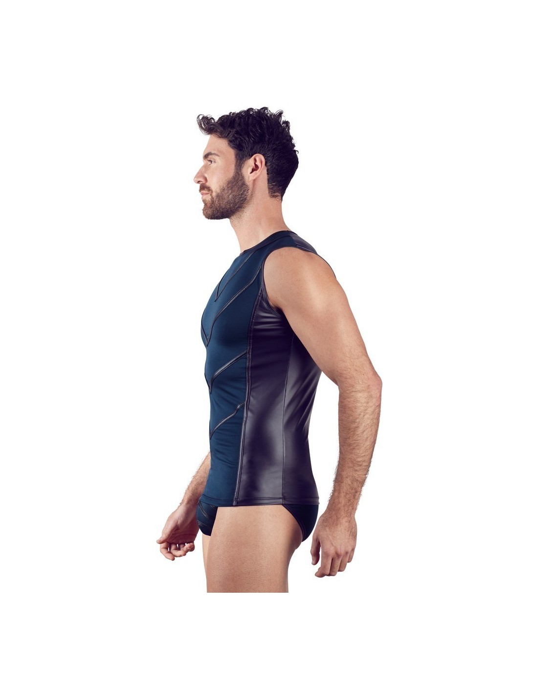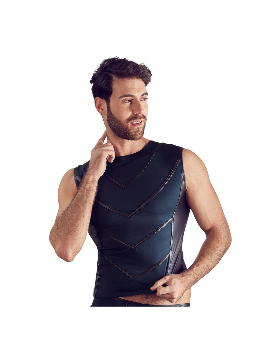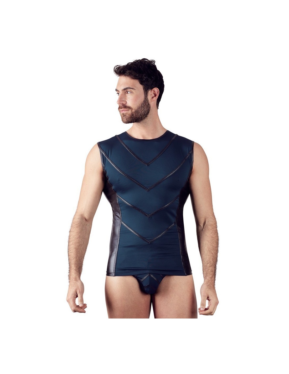 Questa maglia è aderente ma anche molto elastica e questo significa che è molto comoda da indossare. I dettagli opachi sul davanti sottolineano i muscoli di un uomo e aggiungono il tocco finale a questo design alla moda.
