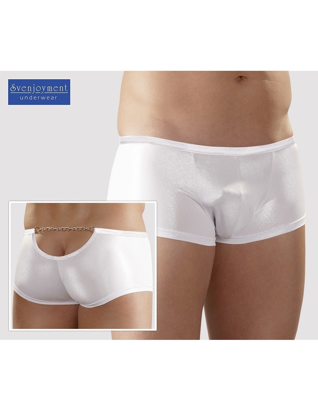 Fantastico boxer con effetto glitter bianco lucido. Dietro presenta una piccola apertura nella parte superiore connessa da catenella argentata.