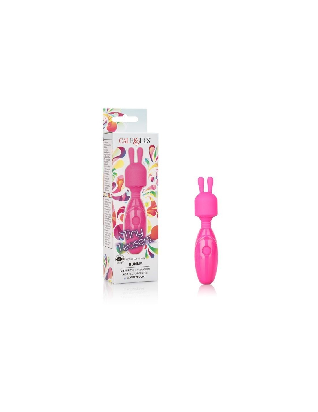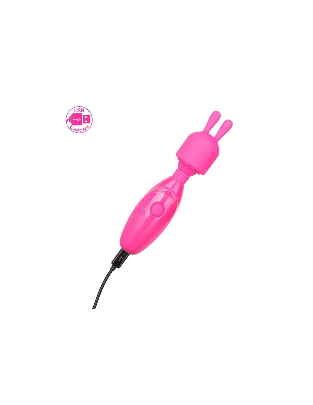 Turn up the heat in your bedroom, in the hot tub or on your next vacation with the discreet Tiny Teasers Bunny. The travel-size mini wand massager will thrill anywhere you go with the flexible neck and 3 intense speeds of vibrations. With only the touch of a button, this whisper quiet vibrating massager easily increases vibration intensity; apply the bunny tip to sweet spots while three powerful vibration speeds pulse and stimulate. Effortlessly control pure pleasure with a single easy-touch silicone button. Hold the easy push- button for 3 seconds to turn on or off. The wand massagers pleasure tip with soft silicone bunny ears flicker and pulse with every push of the button. Plus, the bunny tip is removable for even more pleasure possibilities. The flexible neck and supple surface lets you deliver sensual vibrations from almost any angle. Use the smooth single button control to control up to 2.5 hours of vibrating pleasure. Charge up your passion in only 50 minutes by plugging the provided USB cable into the self-sealing charging port on the back of the massager. The slim vibrating massagers discreet size makes it the perfect travel companion, slip this petite vibe into your pocket, purse or overnight bag to bring ecstasy wherever you go. Enjoy on-the-go pleasure with this fun vibration massager from the Tiny Teasers collection.
